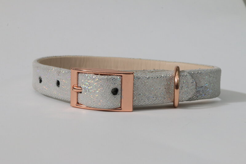 Collare taglia XS in pelle di capretto effetto glitter su base argento e fodera in nappa